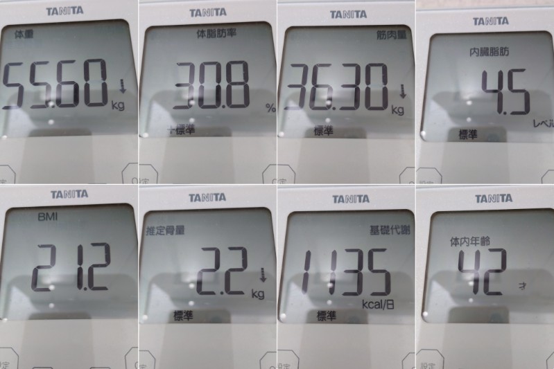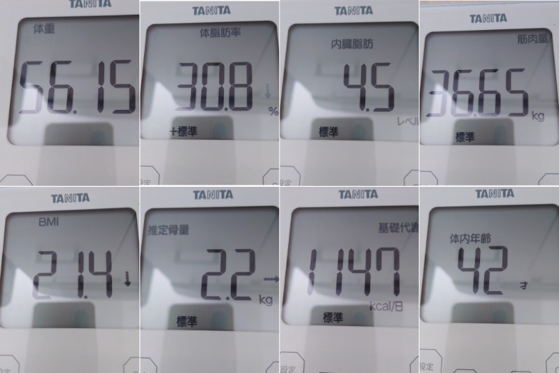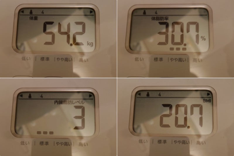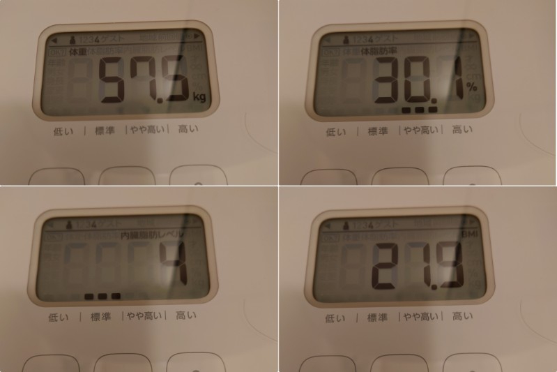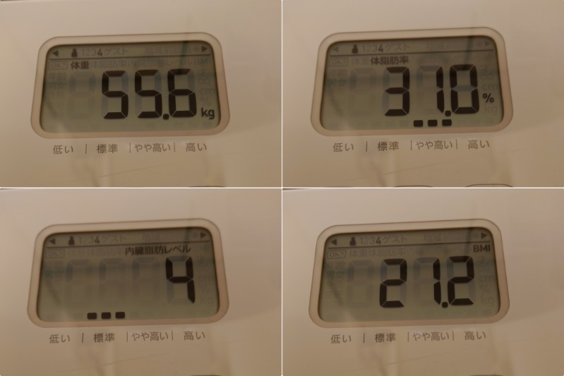 開始日の前日はいつも通り好きなだけ飲み食いして寝たので、むくみもあり体脂肪率が低く出ています。