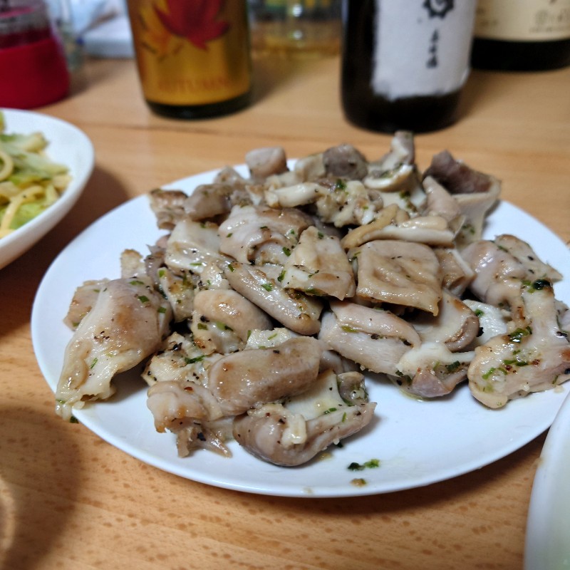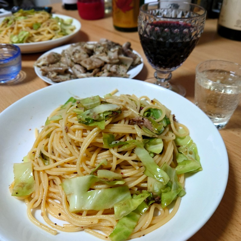 帰宅後、ツナとキャベツのペペロンチーノをメインにもち豚館で買ったガツと豚足で呑む!!