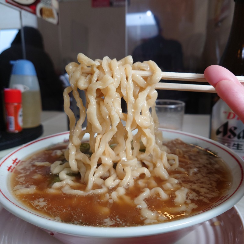 ツルツルぶりんぶりんむちもちの麺と、しょっぱくて煮干しがガツンと効いたスープがビールに合う~~~🥰
