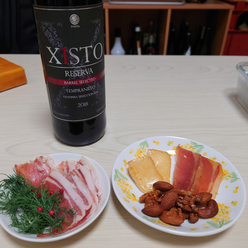 田邉さんの投稿では、ファミマで売っているハモンセラーノ14カ月熟成と相性がいいとあったけど、自宅には18カ月熟成のハモンセラーノ原木があるので🥰