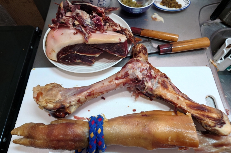 そうだ、今日は肉の日だし、乾燥がすすんで固くなった生ハム原木を解体しよう。