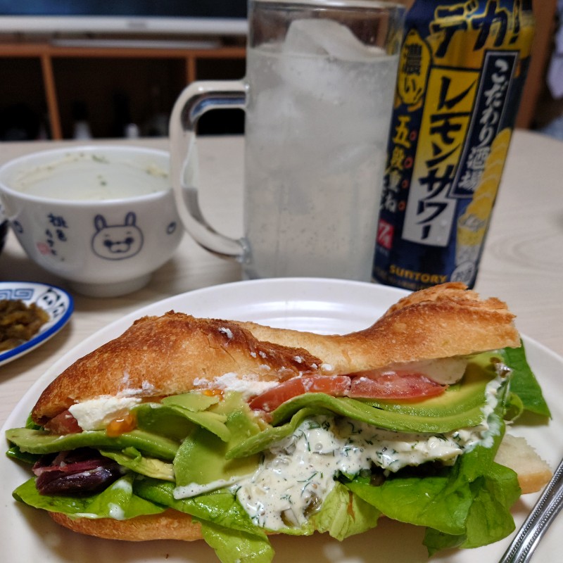 バッゲットにたくさんの具材を挟んだサンドイッチと、こだわり酒場のレモンサワーとのマリアージュを楽しむ…