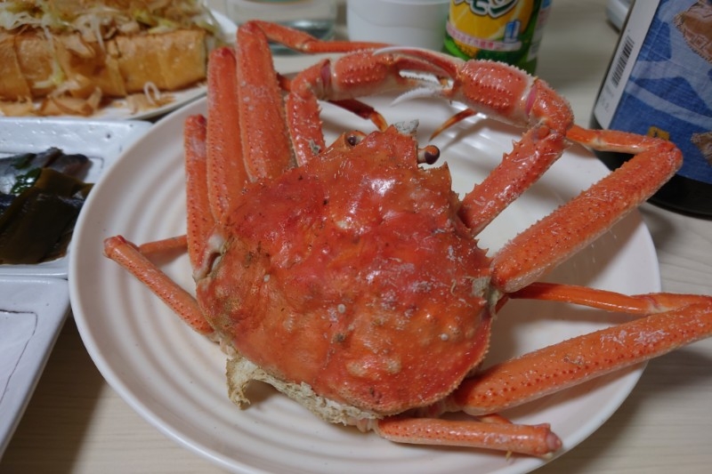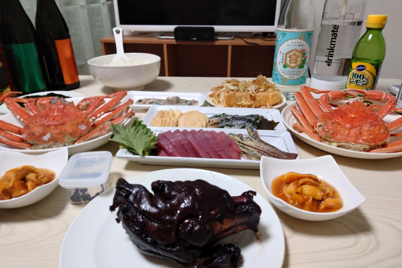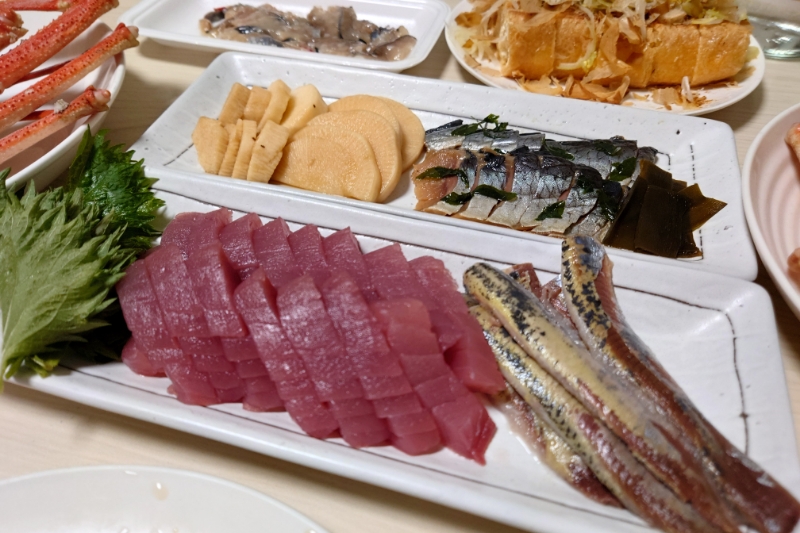 鮮ど太助市でゲットした1杯500円くらいのカニ(生きているのを蒸した!)、鮮度抜群でプリップリの大きなホヤ、栃尾の油揚げ、キハダマグロ(100g198円!)、いわしのお刺身(500g398円!)などなど…