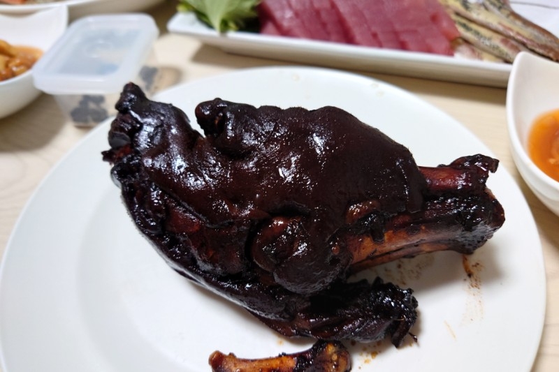 豚足大きくて食べずらいな??と思って持ち上げてみたら、2つにカットされていてビックリした😯
