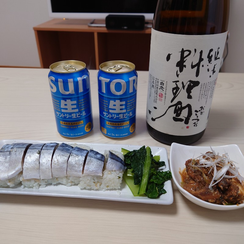友人と家飲みした〆に、鮮ど太助市で6枚322円で購入したしめ鯖を押し寿司にして〆🍻